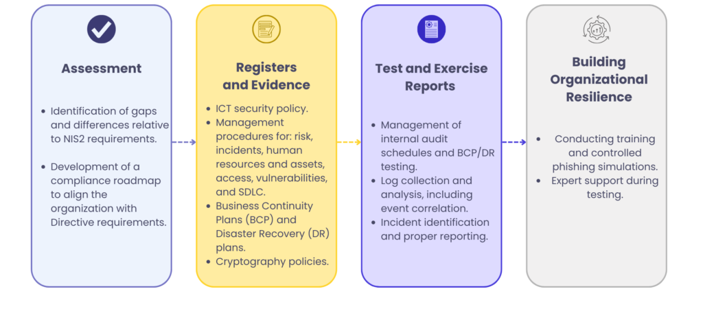| Developing and maintaining incident handling processes in accordance with the requirements and deadlines indicated in NIS2 | Security incident and incident management processes and procedures. Depending on the needs and size of the organization, it may also include playbooks describing the processes of handling security events, and a SOC 24/7 service. |